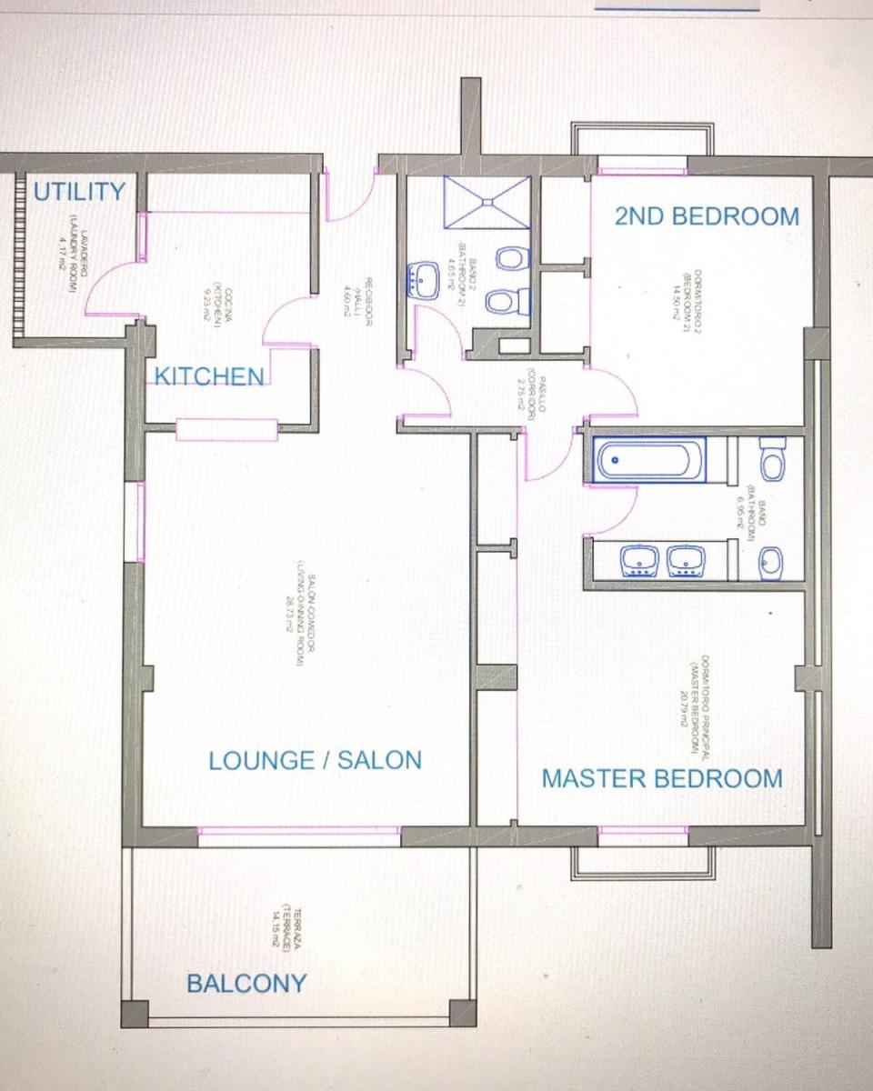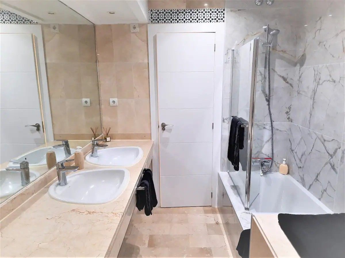Apartment details: A very spacious and comfortable apartment in the best location. The interior is tastefully decorated with good-quality furnishings and the apartment is centrally air-conditioned for heating or cooling throughout. The master bedroom, with Juliet balcony and a luxury super king-sized bed. The contemporary guest bedroom has twin beds. Each bedroom has an ensuite marble bathroom. One bathroom has a walk-in shower, the other bathroom has a full bath tub with shower. The elegant lounge has a flat-screen TV with streaming service offering thousands of international channels in many languages including sports, Sky, movies, TV series, and children’s programmes. It also has a dining area that seats six. The modern kitchen is fully fitted with fridge/freezer, microwave, electric hob and oven, kettle, coffee maker and toaster. As well as a dishwasher, washing machine and separate dryer in the adjacent laundry room. All cutlery, crockery, utensils, glassware, etc are provided including pans and oven dishes. There is a convenient serving hatch from the kitchen to the dining area. An iron, ironing board and hairdryers are provided. You can also dine alfresco, as the balcony has a smart rattan dining table that can seat six.